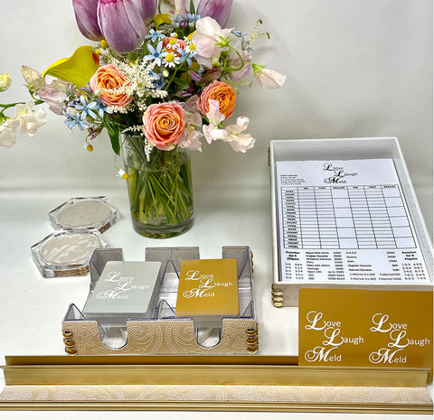 Each piece is made to match. You can customize your tray to match a set of coasters, the trim of your table cloth, the card holders, the pad holders, and even the tote bags! We offer playing cards to match your set as well.